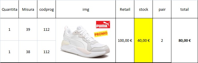 Stock scarpe (2 paia) Puma donna misure 38 e 39 €80,00 (Totale IVA inclusa) – Vendita a cartoni o singola. La vendita singola paga un extra di €10 al paio. Costo di spedizione per 1 paio €3,99 – costo spedizione per 2paia €5,99